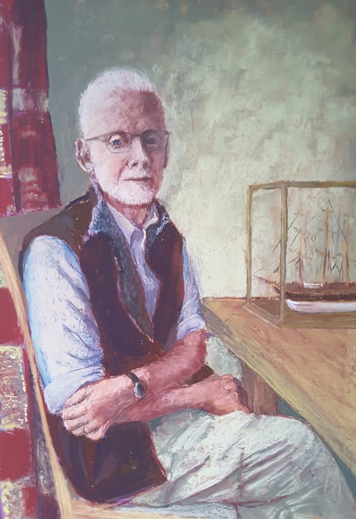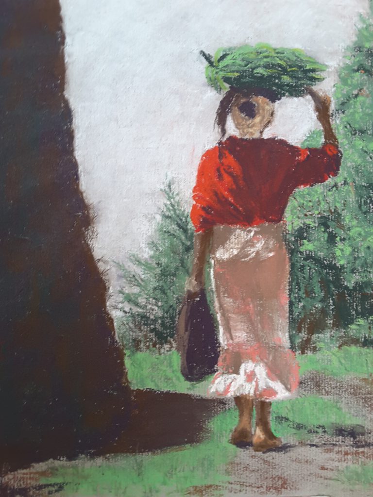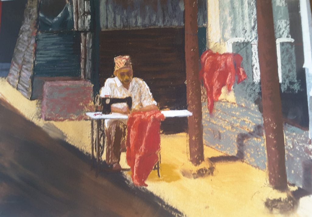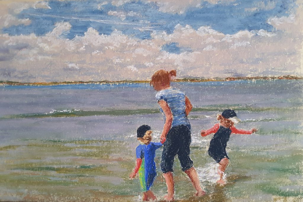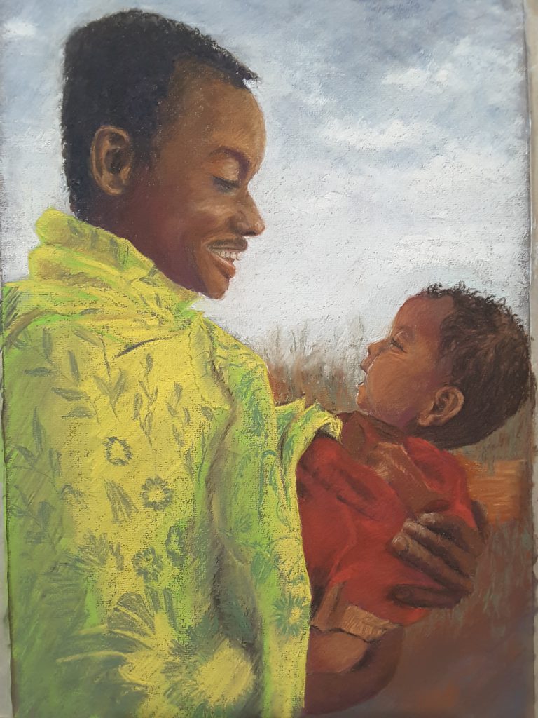I really liked this colourful photo of a dad enjoying smiles with his son, so I painted it in pastels. It was a delightful exercise in colour, especially the shawl, as well as working to capture the figures.