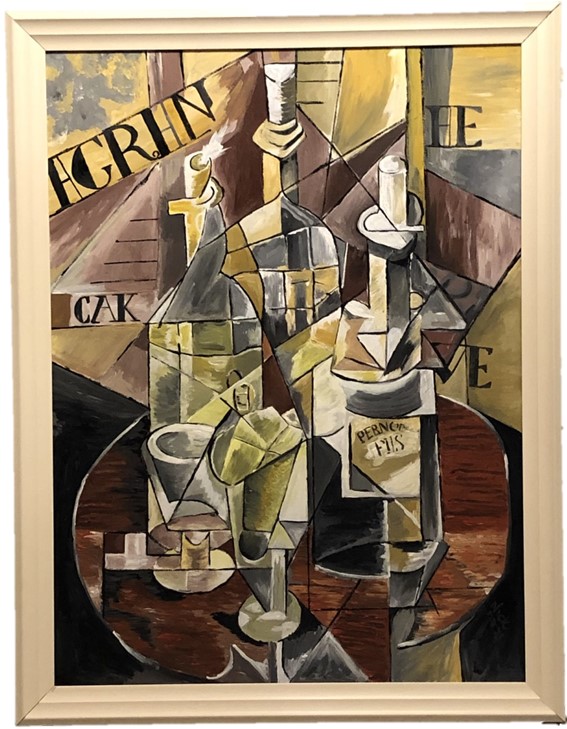 I’m sure the original ‘Cafe Table’ by Picasso has only one bottle, so mine is likely to be a copy of a copy not done by Picasso! This work is acrylic on canvas board, 61cm x 82cm
