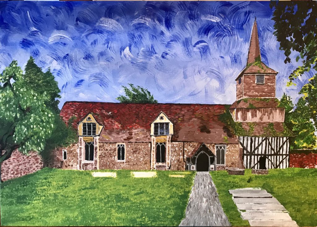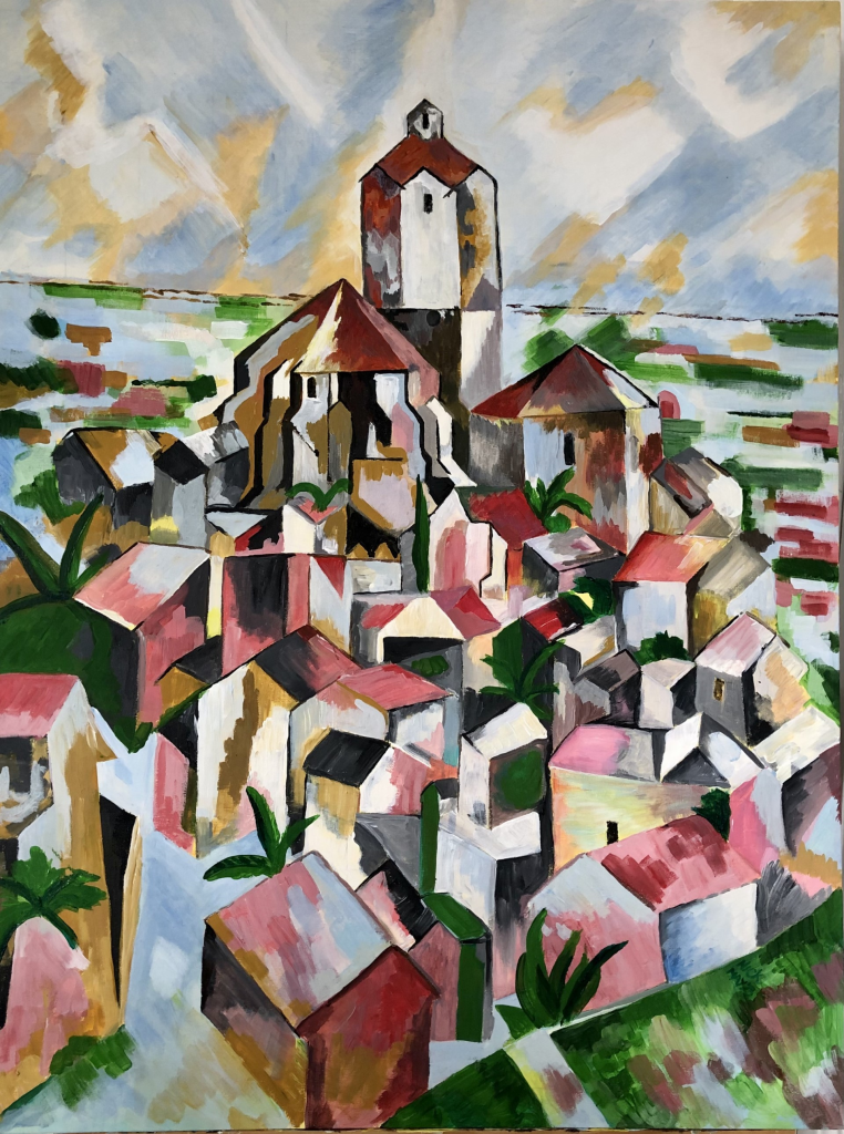 This is my copy of John Myatt’s village in the style of Pablo Picasso. The work is acrylic on canvas board 61cm x 82cm