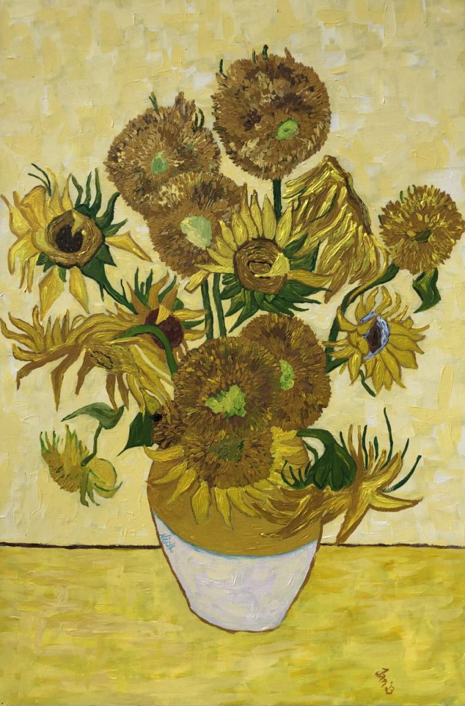 My copy of Vincent Van Gogh’s ‘Sunflowers’, The Van Gogh Museum, Amsterdam, acrylic on stretch canvas 61cm x 91.5cm