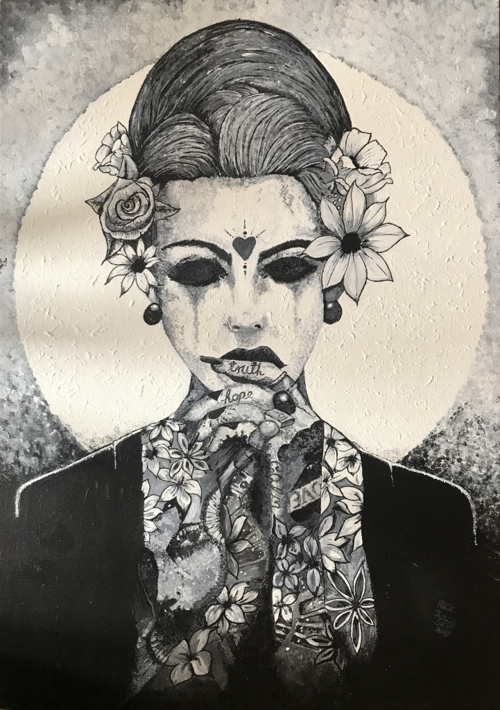 This was requested by my daughter for her home, a copy of Terry Bradley’s No Words. Monochrome acrylic on stretch canvas. 41.5cm x 59cm